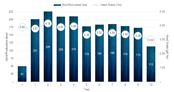 - Average annual production of ~190,000 ounces of gold over a 10-year mine life (202,000 ounces in the first 5 years) with first gold anticipated in H2 2027, assuming construction commences in Q3 2025, subject to progress on ongoing project financing discussions